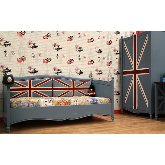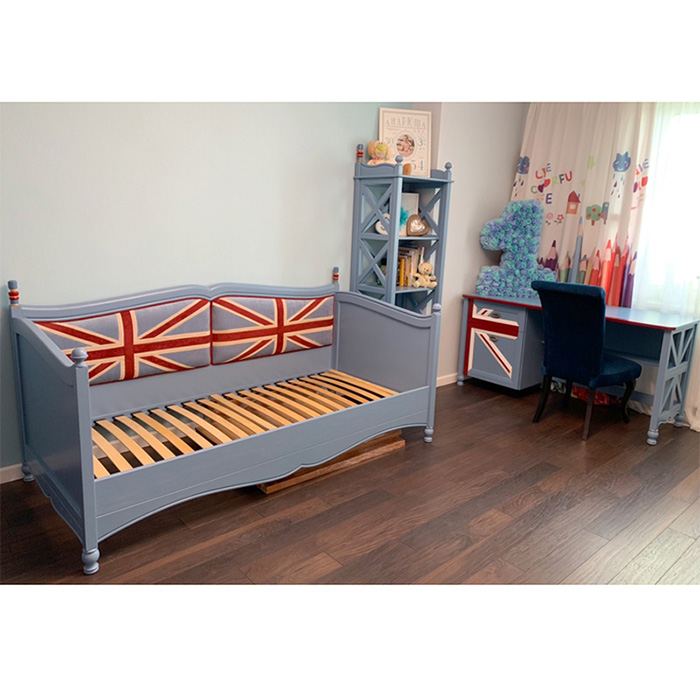 Дитяча Ліверпуль виготовлена з екологічно чистої деревини ясена. Меблі відповідають усім критеріям ергономіки. Еклектична стилістика робить цю колекцію оригінальною. Елементи британського прапора є пікантною родзинкою на фоні легкої неокласики.