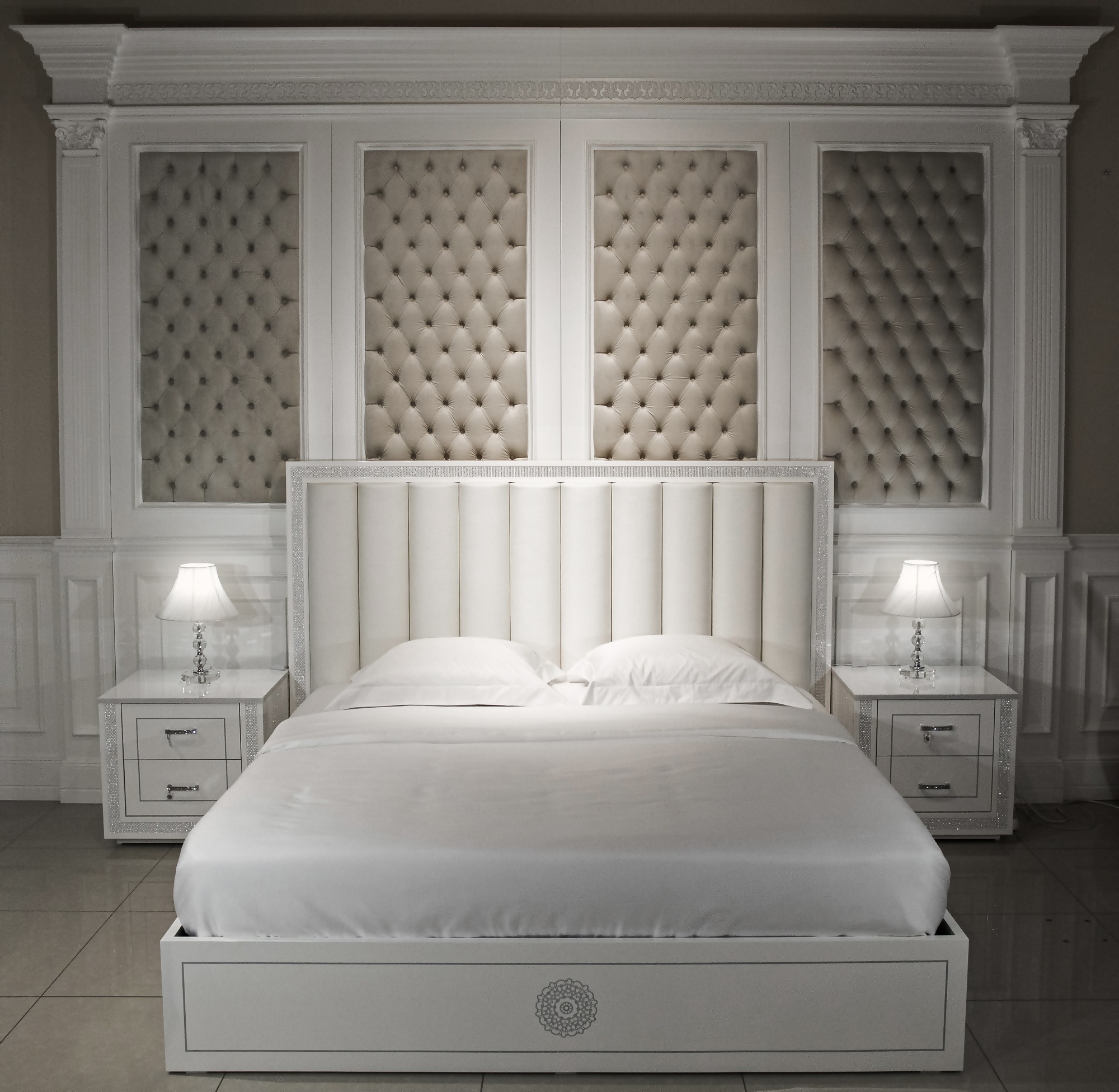 Элегантная спальня в белом глянцевом лаке, обрамлении молдингов с декорами в стиле Coco Chanel и ручками Swarovski.
